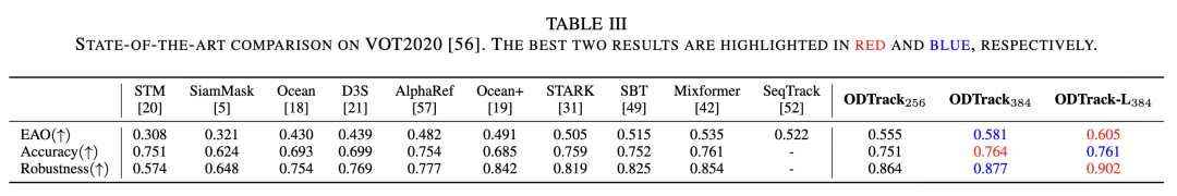 VOT2020. VOT2020 comprises 60 challenging sequences and uses binary segmentation masks as ground truth. We employed Alpha-Refine as the post-processing network for ODTrack to predict segmentation masks. The Expected Average Overlap (EAO) metric was used to evaluate the proposed tracker and other advanced trackers. As shown in Table III, our ODTrack384 and -L384 achieved the best results in mask evaluation, with EAO scores of 58.1% and 60.5%, respectively. Compared to trackers that did not explore temporal relationships (i.e., SBT and Ocean+), ODTrack outperformed them by 6.6% and 9% on the EAO metric, respectively. These results indicate that by injecting temporal token attention, our ODTrack exhibits robustness in complex tracking scenarios.
