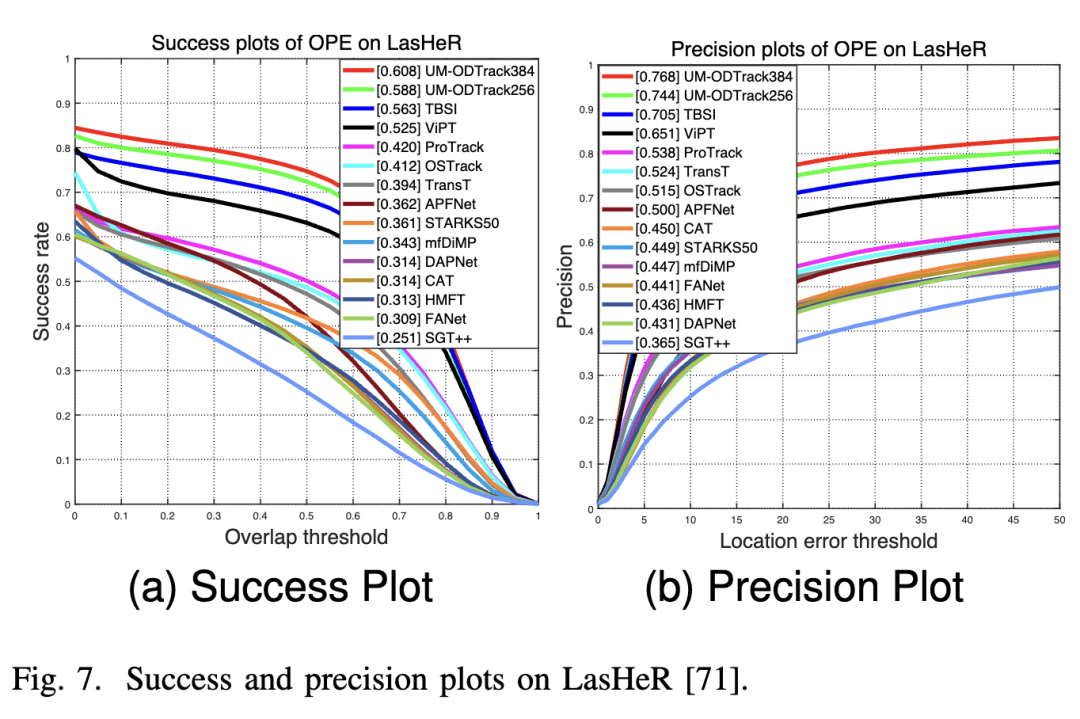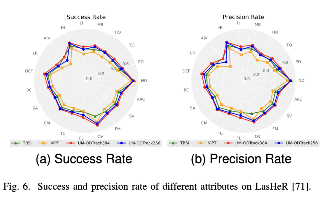 LasHeR. LasHeR is a large-scale RGB-T tracking dataset containing 245 short-term test video sequences. The results are reported in Figure 7 below, where our UM-ODTrack achieved surprising results, significantly outperforming the previous SOTA RGB-T tracking algorithms by 4.5% and 6.3% on the success and precision plots, respectively. These results align with our expectations that feature learning based on the gated attention mechanism can adaptively extract and fuse features from different modalities to improve multimodal tracking performance. Meanwhile, to verify that our gated perceptron can effectively address various challenges, including occlusion (NO), partial occlusion (PO), total occlusion (TO), low illumination (LI), low resolution (LR), deformation (DEF), background clutter (BC), motion blur (MB), thermal crossover (TC), camera motion (CM), fast motion (FM), scale variation (SV), transparent occlusion (HO), high illumination (HI), abrupt illumination variation (AIV), similar appearance (SA), aspect ratio change (ARC), out-of-view (OV), and frame loss (FL), we present the attribute evaluation results on the LasHeR dataset. As shown in Figure 6, our UM-ODTrack performed well on each attribute. Therefore, it can be demonstrated that our video-level multimodal modeling scheme with a gated perceptron can effectively unify and fuse multimodal features, enabling our tracker to handle complex tracking scenarios effectively.