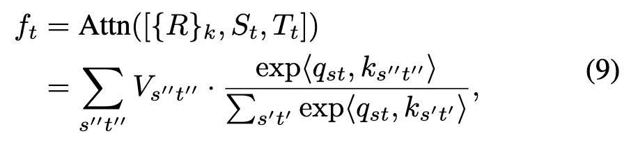 Here, is the temporal token sequence of the i-th video frame. denotes the concatenation operation between tokens. , , and are the spatiotemporal linear projections of the concatenated feature tokens.