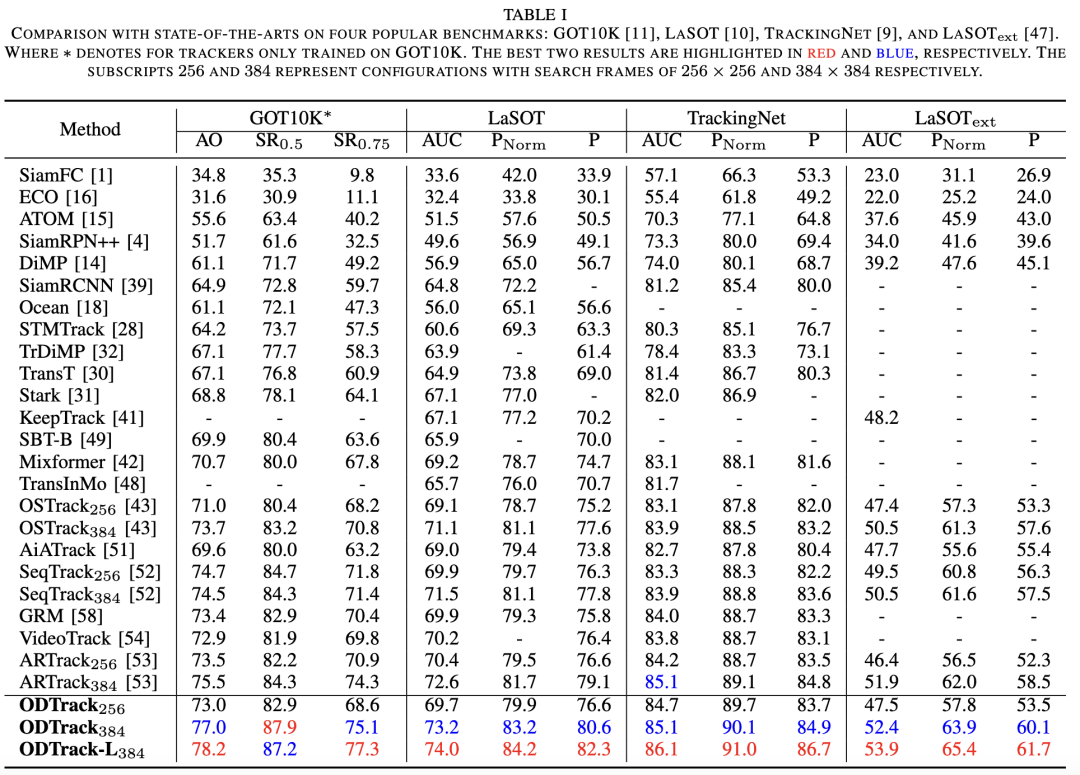 GOT10K. GOT10K is a large-scale tracking dataset containing over 10,000 video sequences. The GOT10K benchmark proposes a protocol requiring trackers to be trained using only its training set. We adhere to this protocol to train our framework. The results are recorded in Table I. Among previous methods, ARTrack384, which does not employ a video-level sampling strategy, achieves state-of-the-art performance in terms of AO (Average Overlap), SR0.5, and SR0.75 (Success Rate at thresholds of 0.5 and 0.75) metrics. Benefiting from the proposed new video-level sampling strategy, our ODTrack384 attains a new state-of-the-art level, achieving 77.0%, 87.9%, and 75.1% on the AO, SR0.5, and SR0.75 metrics, respectively. The results indicate that one advantage of our ODTrack stems from the video-level sampling strategy aimed at unleashing the model's potential.