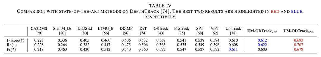 DepthTrack. DepthTrack contains 150 training and 50 testing RGB-D long-term video sequences. As shown in Table IV below, we compared our model with existing state-of-the-art (SOTA) RGB-D trackers on this dataset. Under the same image resolution settings, our UM-ODTrack256 outperformed ViPT by 1.1%, 2.6%, and 1.8% in tracking precision (Pr), recall (Re), and F-score, respectively. Additionally, due to the proposed efficient gated attention mechanism, our UM-ODTrack384 achieved SOTA performance in the RGB-D tracking field. Notably, when the input size increased from 256 to 384, UM-ODTrack achieved a significant performance boost. This indicates that our temporal association method combined with a large input resolution is particularly important in multimodal long-term tracking scenarios.