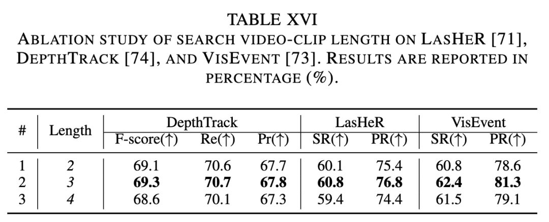 Length of Search Video Clips. The impact of the length of search video sequences on tracking performance was ablated as shown in Table VIII below. When the video clip length increased from 2 to 3, the AUC metric improved by 0.3%. However, a continuous increase in sequence length did not bring further performance improvements, indicating that overly long search video clips impose a learning burden on the model. Therefore, an appropriate length of search video clips should be selected. Additionally, to evaluate the impact of sequence length on multimodal tracking performance, comparative experiments were conducted on the LasHeR, DepthTrack, and VisEvent benchmarks, as shown in Table XVI. The choice of video sequence length is crucial for leveraging temporal information. When the sequence length increased from 2 to 3, our tracker achieved improvements of 0.7%, 0.2%, and 1.6% in SR and F-score on the LasHeR, DepthTrack, and VisEvent benchmarks, respectively. These gains stem from effectively modeling target appearance changes and motion trajectories through multi-frame information. However, when the sequence length exceeded 3, performance tended to stabilize or slightly decline due to the accumulation of cross-modal temporal noise. This confirms that an appropriately chosen sequence length can provide complementary information, while overly long sequences are more likely to introduce redundant or noisy contextual signals. Therefore, our UM-ODTrack adopts a sequence length of 3 as the optimal setting to capture contextual information within a suitable time span.