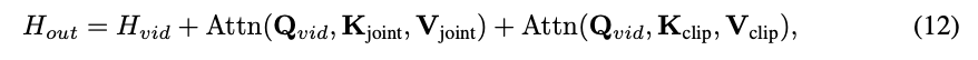 Subsequently, high-level semantic guidance is injected through cross-attention layers. This involves two distinct signals: relational conditions from MLLM for scene composition, and CLIP image features for agent identity. Within each DiT block, evolved video tokens generate query vectors. Conditional signals [MLLM conditions] and [CLIP features] are projected to form their respective key-value matrices. The attention layer's final output is the summation of these information flows, extending Equation 4: