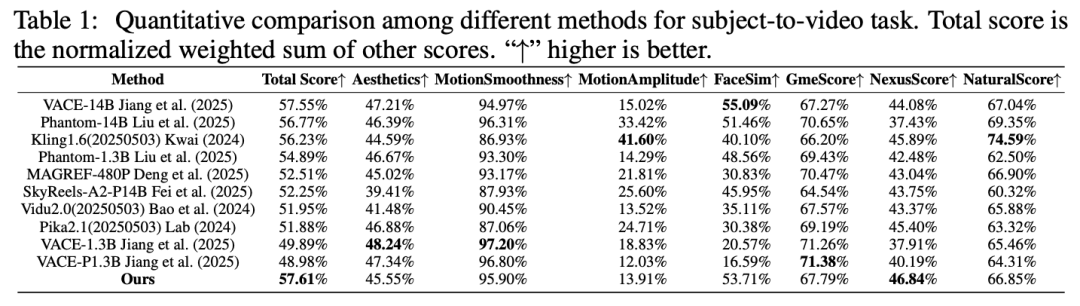 Benchmarks and Evaluation Metrics: To ensure fair comparison, we adopt the OpenS2V-Eval benchmark and follow its official evaluation protocol, which provides fine-grained assessment of subject consistency and identity fidelity for subject-to-video generation. The benchmark includes 180 prompts across seven distinct categories, covering scenarios from single-subject to multi-subject and human-object interactions. To quantify performance, we report the protocol's automated metrics, where higher scores indicate better results across all metrics. These include Aesthetic Score for visual appeal, Motion Smoothness for temporal continuity, Motion Magnitude for movement intensity, and Facial Similarity for identity preservation. We also utilize three human perception-aligned metrics introduced by OpenS2V-Eval: NexusScore for subject consistency, NaturalScore for naturalness, and GmeScore for text-video relevance.
