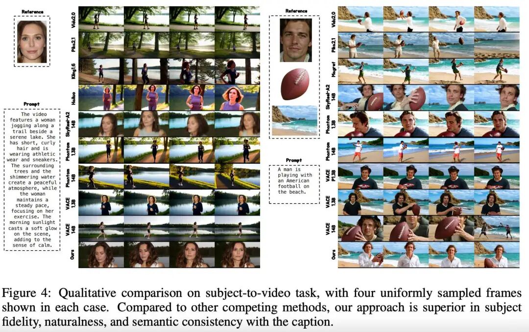 On OpenS2V, achieves comprehensive evaluation across theme consistency, temporal naturalness, and text-video alignment; consistently surpasses all existing open-source and commercial models in theme-consistent video generation tasks, reaching SOTA performance.