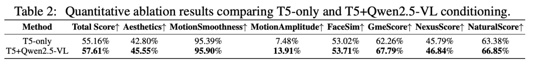 We conduct ablation experiments on the control conditioning mechanism that combines MLLM with T5-derived signals to guide DiT generation. We compare a baseline scheme using T5 alone against our T5+Qwen2.5-VL combination. Notably, the MLLM-only scheme proved unstable during training and failed to converge, thus excluded from quantitative analysis. As shown in Table 2 below, the T5+Qwen2.5-VL combination consistently outperforms the T5-only scheme in aesthetic quality, motion performance, naturalness, and text relevance. The qualitative comparison in Figure 6 further validates this finding: when scale mismatch exists in reference images, the T5-only baseline tends to generate unrealistic subject sizes and frequently misparses action-object relationships under complex instructions, whereas the T5+Qwen2.5-VL combination maintains accurate grounding and executes intended interactions. We attribute these improvements to the complementary conditioning mechanism - MLLM provides multimodal identity and relationship-aware cues to disambiguate subjects and enhance temporal coherence, while T5 offers precise linguistic grounding to stabilize the optimization process. Their concatenation produces richer and more reliable control signals for DiT.