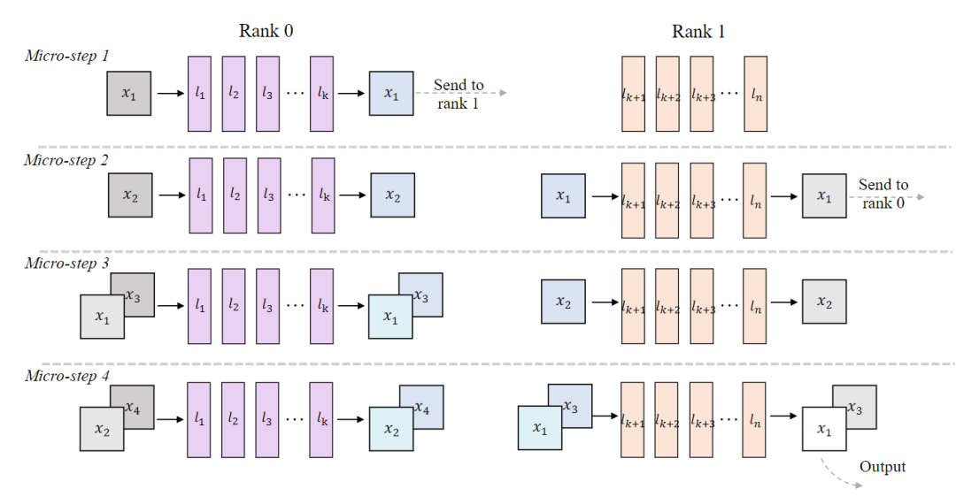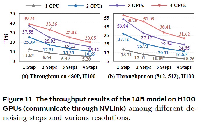 Scalable pipeline orchestration: The DiT module is divided across GPUs, with each GPU processing its input as a micro-step and passing the results to the next GPU in a ring structure. This allows multiple stages to execute concurrently, achieving near-linear throughput acceleration.