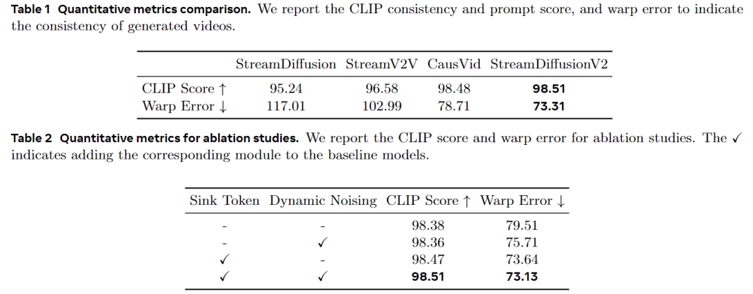 Without TensorRT or quantization, StreamDiffusionV2 achieves first-frame rendering within 0.5 seconds and reaches 58.28 FPS with a 14B parameter model and 64.52 FPS with a 1.3B parameter model on 4 H100 GPUs. Even with increased denoising steps to enhance quality, it maintains 31.62 FPS (14B) and 61.57 FPS (1.3B). The system performs well across different resolutions, denoising steps, and GPU scales, supporting flexible trade-offs between low latency and high quality. It surpasses baselines in metrics such as CLIP score (98.51) and Warp Error (73.31), significantly improving long-sequence consistency and motion handling capabilities.