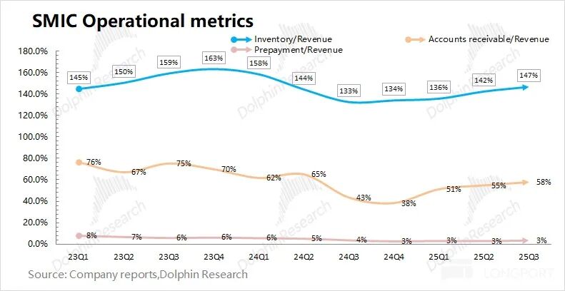Considering the relationship between inventory & accounts receivable and revenue in the balance sheet, the inventory-to-revenue and accounts receivable-to-revenue ratios were 147% and 58%, respectively, this quarter. From an operational indicator perspective, SMIC's inventory share has increased. The company typically ramps up inventory in the third quarter, and overall, it remains at a relatively reasonable level.