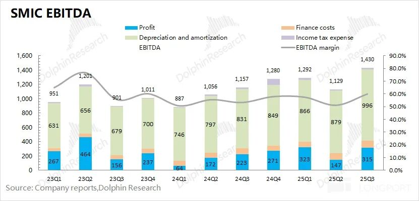 Breaking down the indicators, SMIC's EBITDA primarily comes from the release of operating profits and depreciation and amortization. The calculated profit margin (before interest, taxes, depreciation, and amortization) rebounded to 60% this quarter. The increase in the company's profit this quarter was mainly driven by improved gross margins and reduced administrative expenses.
