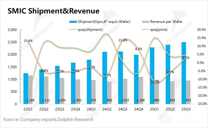 1) Volume: Q3 wafer shipments (8-inch equivalent) reached 24.99 million units, up 4.6% QoQ.