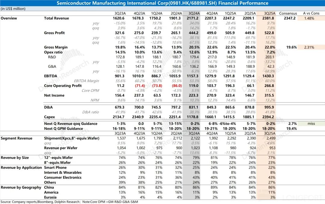 1. Overall Performance: SMIC achieved revenue of $2.38 billion in Q3 2025, largely in line with market expectations ($2.35 billion) and up 7.8% QoQ, slightly above the guidance range (5-7% QoQ growth). The revenue growth was primarily driven by a recovery in demand for consumer electronics, industrial & automotive, and smart home applications.