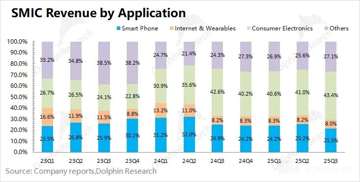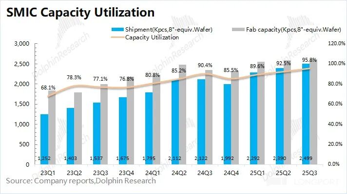 In the third quarter of 2025, SMIC's capacity utilization rate reached 95.8%, continuing to rebound from the previous quarter. Considering the company's revenue structure and next quarter's revenue guidance, Dolphin Research believes that the rebound in capacity utilization this quarter was mainly driven by increased demand in consumer electronics, industrial and automotive, and smart home sectors.