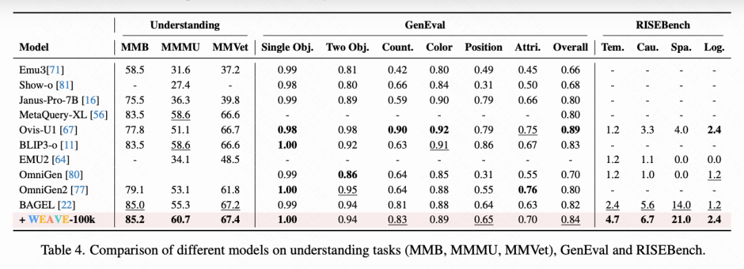 To verify data effectiveness, this paper conducted experiments on Bagel. Performance improvements were achieved across four task categories: (i) Visual understanding. This paper's data effectively enhances understanding task performance, particularly achieving a 9.8% improvement on MMMU. (ii) Image editing. As shown in Table 3 below, fine-tuned Bagel achieves a 4.8% overall score improvement on GEditBench. The model surpasses the baseline version in most tasks, with particularly notable improvements in material change (13.4%) and style change (15.6%) categories. (iii) Understanding-generation synergy. Table 4 above shows that fine-tuned Bagel achieves significant improvements in RISE cognitive tasks. Both spatial reasoning and logical reasoning tasks demonstrate 100% performance growth, indicating that the fine-tuned model more effectively utilizes understanding capabilities and world knowledge to enhance the generation process. These findings confirm the high-quality characteristics of the WEAVE-100k approach. (iv) Interleaved cross-modal understanding and generation. As shown in Table 2, this paper's fine-tuned model achieves a 42.5% improvement over Bagel on WEAVEBench. Performance on more challenging scientific questions improves by 34.6%, indicating that training with this dataset significantly enhances models' interleaved cross-modal understanding and generation capabilities.