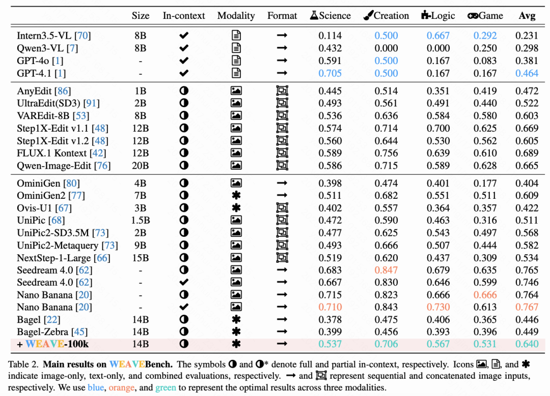 Empirical Research Breakthrough: Verified that training based on WEAVE-100k significantly enhances model performance on traditional benchmarks and effectively elicits the emergence of visual memory capabilities. WEAVEBench evaluation results reveal persistent technical limitations in existing models regarding multi-turn context-aware generation.
