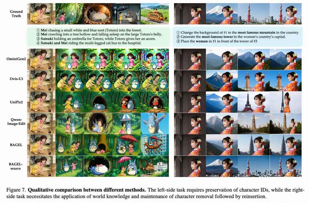 As shown in Figure 7 below, through quality result analysis, this paper draws the following conclusions: (i) Instruction-following capabilities still require improvement. For example, in the left case of the figure, OmniGen and Ovis fail to correctly execute generation; in the right case's third column, Qwen-Image-Edit only generates the tower without including any human figures. (ii) Fine-tuning based on the WEAVE dataset elicits visual memory capabilities. The fine-tuned model correctly distinguishes between protagonists wearing pink and yellow clothes in the left case and demonstrates the ability to first remove human figures and then reintegrate them in the right case.