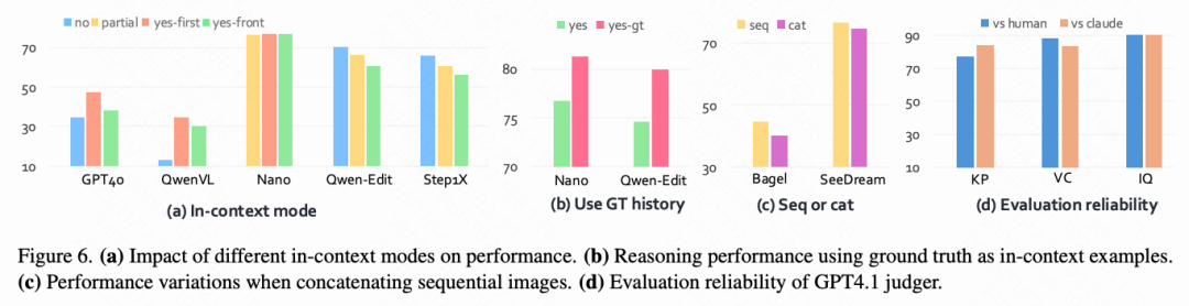 Context utilization is critical (a) For understanding tasks, using contextual information brings significant performance improvements compared to baseline conditions without historical context. As shown in Figure 6(a), QwenVL demonstrates a notable 163% improvement, indicating WEAVEBench's success in incorporating historical information into model evaluation. (b) For generation tasks, increasing contextual content produces differentiated effects across model types. Open-source models exhibit gradual performance declines as historical context increases—Qwen-Edit shows performance decreases of 5.3% and 8.6%, respectively. This suggests that open-source models, limited by single-turn editing capabilities, experience reduced positioning accuracy when processing extended contextual information and thus cannot effectively utilize contextual data. Conversely, closed-source models like Nano demonstrate progressive improvements, indicating successful utilization of contextual information. (c) WEAVEBench exhibits excellent image quality. As shown in Figure 6(b), using WEAVEBench real images as contextual examples enhances performance for all models. Notably, Qwen-Image-Edit shows a significant 7.1% improvement, possibly due to its inherently weaker generation capabilities compared to nano-banana [21].