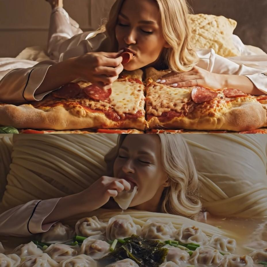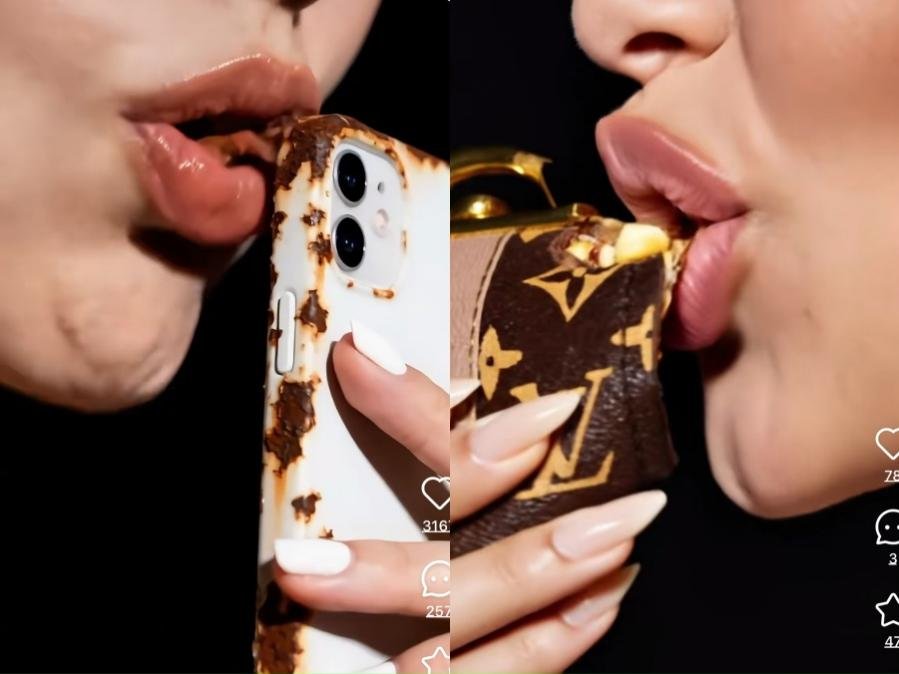 On major short-video and social media platforms, the videos updated by AI mukbang and AI ASMR accounts showcase a wide array of 'foods', both real and imaginary. The most common are fluorescent-colored, jelly-like dolls, fruits, or vegetables, as well as diamond and crystal-encrusted hamburgers and cakes. More advanced options range from rusty phones and mechanical watches to LV wallets, foundation, lipstick, and eyeshadow. Some even feature a bed made of pizza or hotpot, with the host lying in and 'eating' the food.