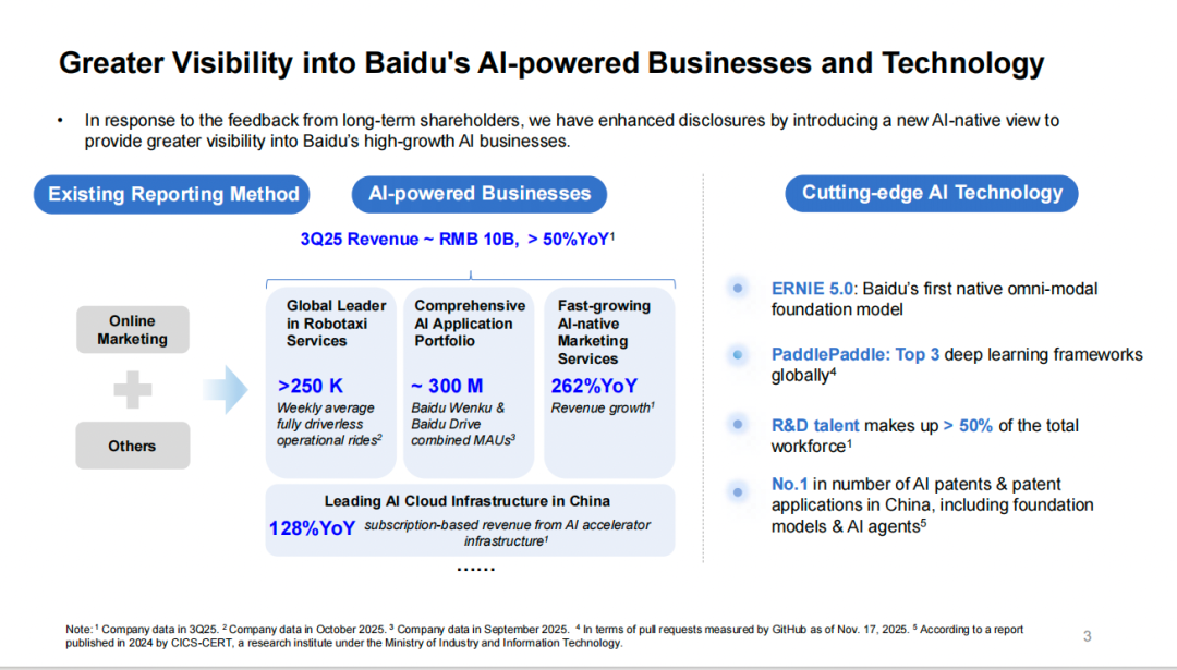 Baidu has long branded itself as an AI - centric company. However, it was only with the release of its Q3 financial report today that we truly witnessed the firmness and assertiveness of Baidu's commitment to AI.