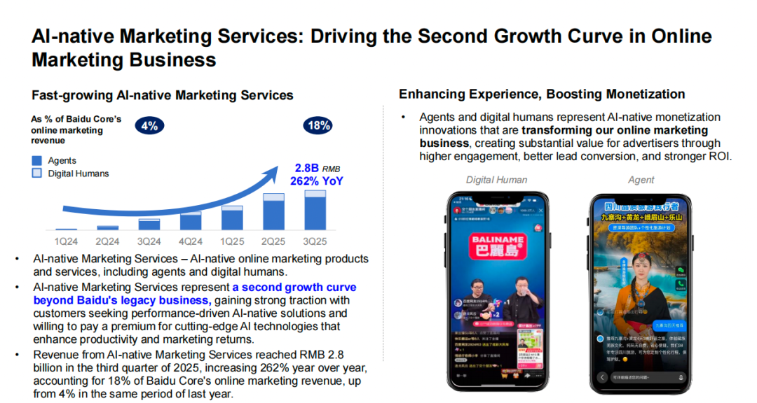 AI - native marketing services generated 2.8 billion yuan in revenue this quarter, a year - on - year increase of 262%. Innovative service forms, including intelligent agents and digital humans, are gaining market recognition with significant advantages. More and more clients seeking AI - driven solutions and willing to pay for technology have achieved dual improvements in productivity and marketing effectiveness through this service.