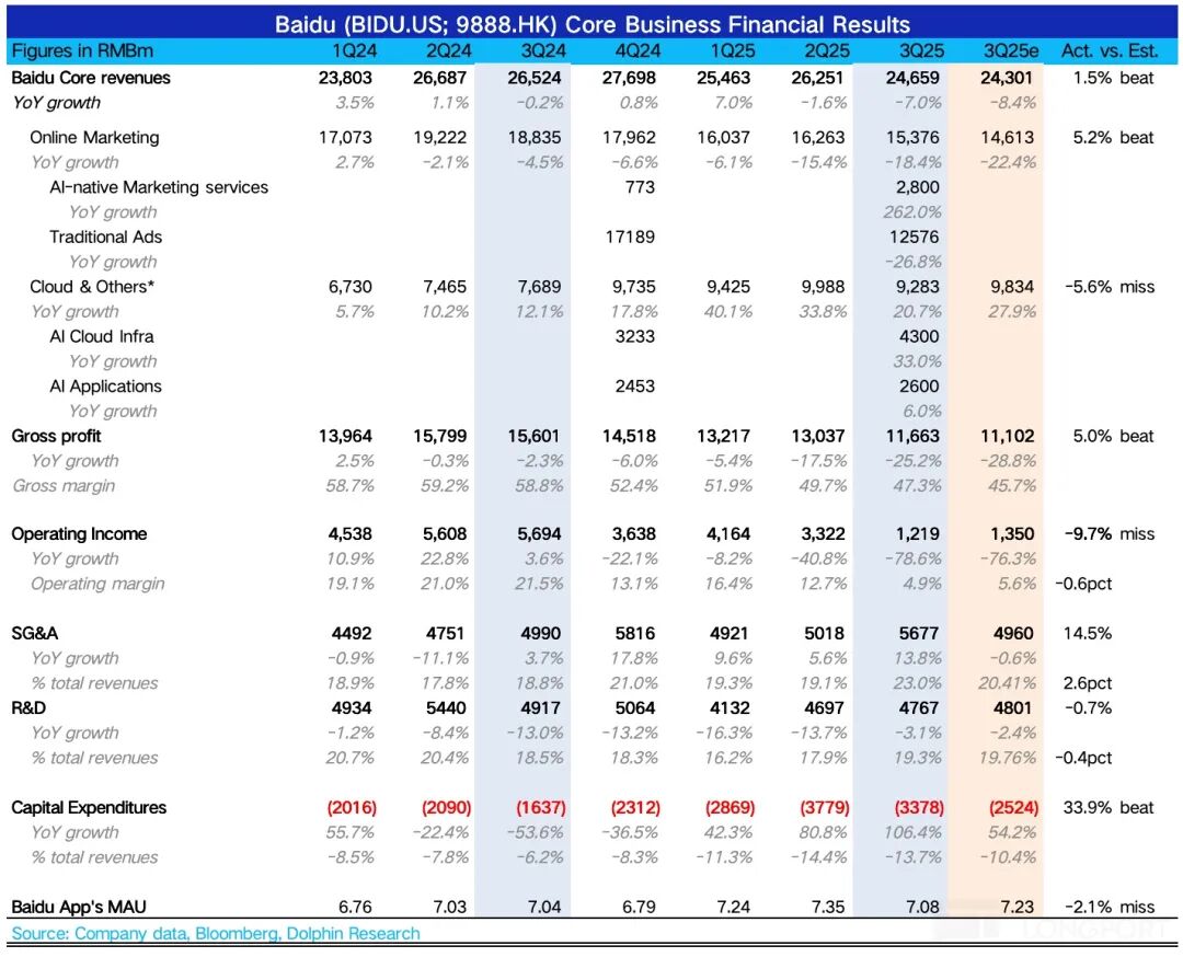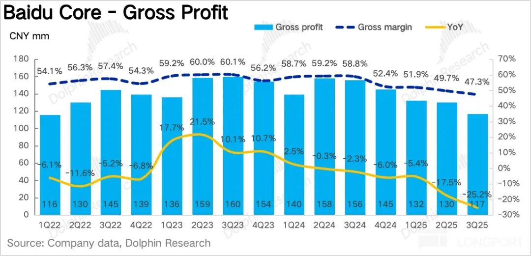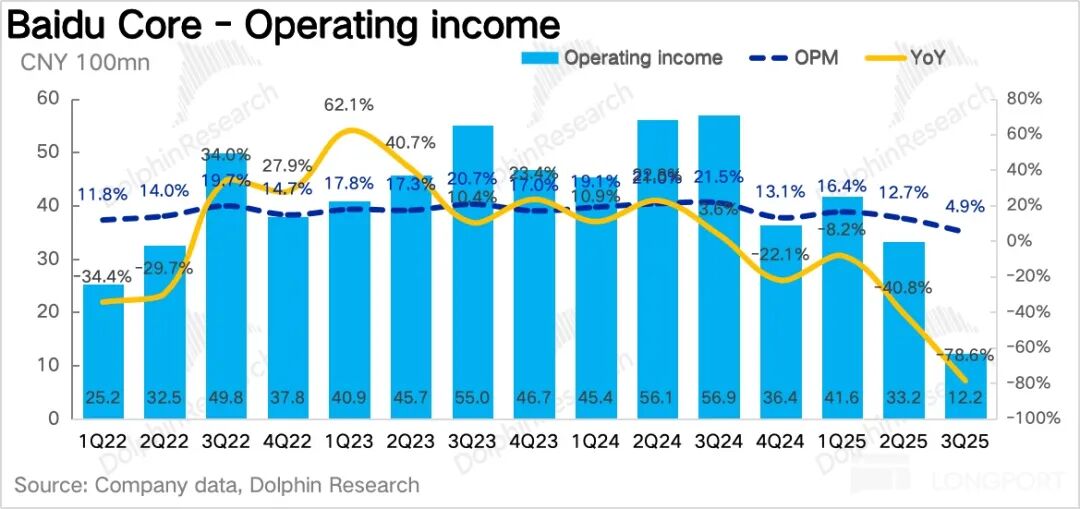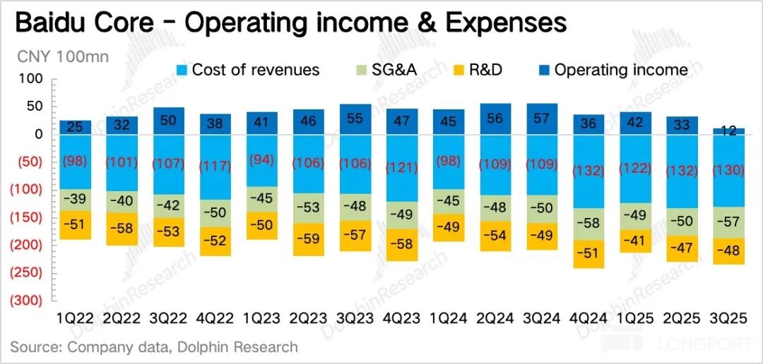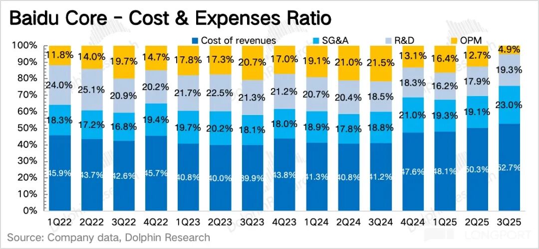 4. Core Profit Margin Pressure Eases: Baidu Core's operating profit (gross profit minus three operating expenses) fell to 1.2 billion yuan in Q3, with a profit margin of just 5%, well below normal levels. This is due to:
