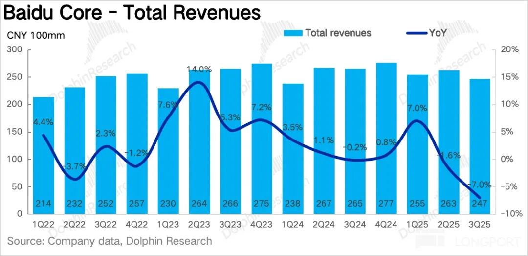 The two segments are clearly separated, and with iQIYI as an independently listed company providing detailed data, Dolphin Research dissects both. Due to approximately 1% (200-400 million yuan) in intersegment eliminations, our breakdown of Baidu Core may slightly differ from reported figures but does not affect trend analysis.