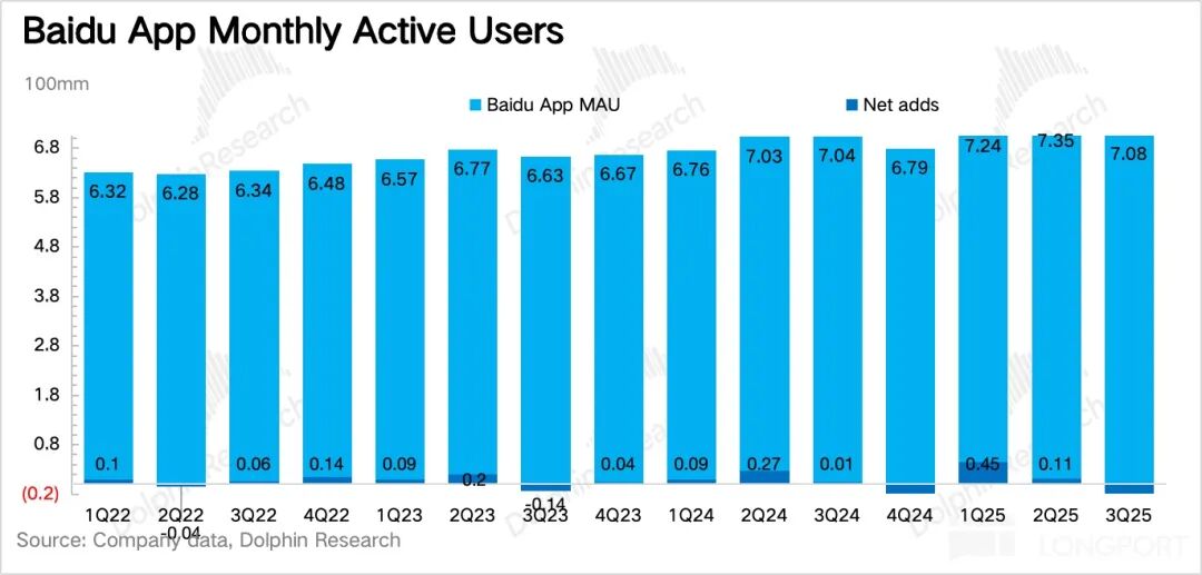 User metrics also raise concerns. Baidu Mobile's MAU declined by 27 million QoQ in Q3, an improvement over last year but indicating diminishing positive effects from AI-enhanced search experiences introduced earlier this year. This also suggests traffic migration.