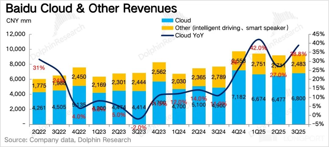 (2) AI applications generated 2.6 billion yuan in revenue, up 6% YoY, primarily from Baidu Wenku, Baidu Netdisk, and digital employees. Despite being AI+, growth was sluggish, likely dragged down by Baidu Netdisk (due to this quarter's promotional discounts) and other miscellaneous factors. Competition from Quark and WeChat Disk, which recently upgraded their features or services, cannot be ignored.