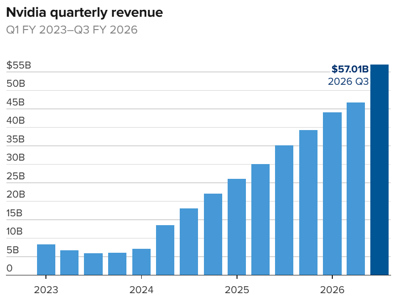 On November 19 (ET), Nvidia released its Q3 financial report for fiscal year 2026. The numbers were staggering: $57 billion in revenue, marking a 62% year-over-year (YoY) increase, and $31.9 billion in net profit, a whopping 65% YoY surge. The driving force behind this "epic" performance was its data center business, which generated $51.2 billion in revenue, a 66% YoY spike, accounting for nearly 90% of the total revenue. This surge boosted Nvidia's after-hours stock price by over 4% and provided a Q4 revenue guidance of $65 billion, once again surpassing Wall Street's expectations.