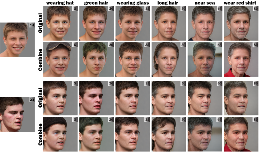 Thanks to the flexibility of two-stage editing, in addition to independently altering age, this method can also simultaneously perform face attribute editing. For instance, it can seamlessly apply various attributes such as glasses, green hair, or hats while continuously aging the face, significantly enhancing the diversity and controllability of generated images.