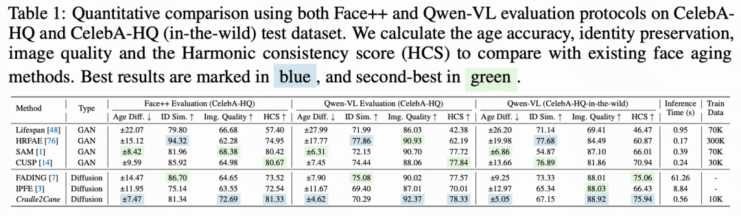 Experiments conducted on the CelebA-HQ and CelebA-HQ (in-the-wild) datasets demonstrate that Cradle2Cane achieves state-of-the-art (SOTA) performance under both Face++ and Qwen-VL multimodal large model evaluation protocols. Notably, on the HCS (Harmonic Consistency Score) metric, this method significantly outperforms baseline models such as SAM, CUSP, and FADING.