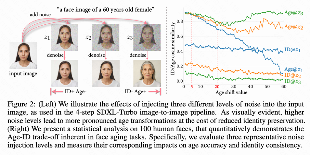 The objective of this stage is "precise aging." The authors discovered that the larger the age span, the more significant the required image structural changes. Consequently, the AdaNI mechanism dynamically adjusts the noise level injected into the latent space based on the disparity between the target age and the source age.