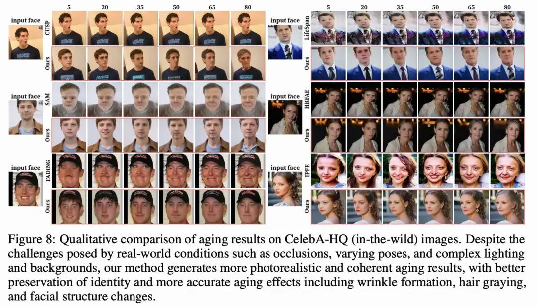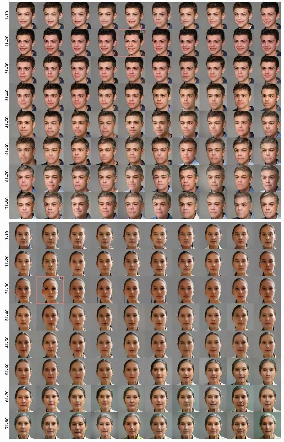 Traditional GAN methods (e.g., Lifespan, CUSP): Although they perform reasonably well in identity preservation, they often produce blurry results when dealing with large age spans (e.g., from infancy to old age) and struggle to realistically simulate skin texture and bone structure changes.