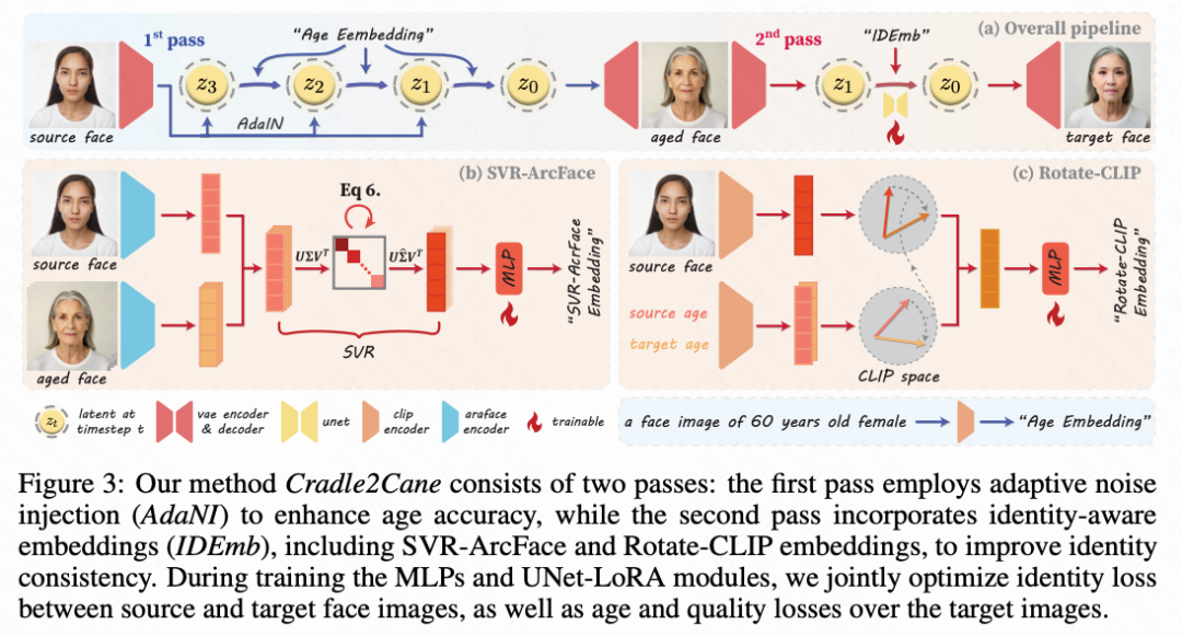 This paper proposes a two-stage (Two-Pass) diffusion framework based on SDXL-Turbo, known as Cradle2Cane. The core concept of this solution is "decoupling": dividing age transformation and identity preservation into two separate subtasks for optimized performance.
