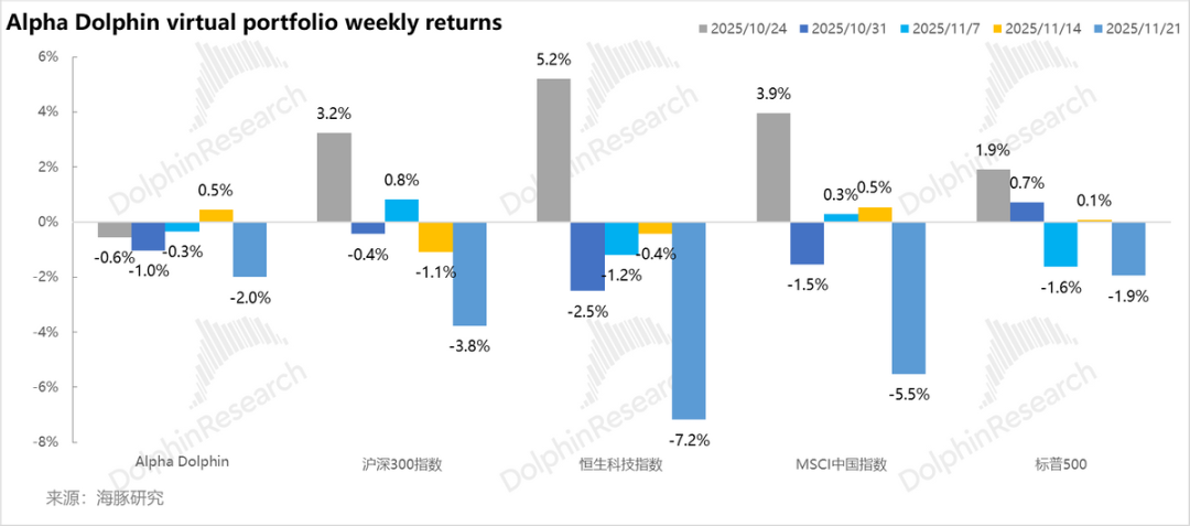 Last week, Dolphin Research's virtual portfolio, Alpha Dolphin, made no adjustments. It declined by 2% for the week, outperforming the CSI 300 (-3.8%), MSCI China Index (-5.5%), and Hang Seng Tech Index (-7.2%), but slightly underperforming the S&P 500 (-1.9%).