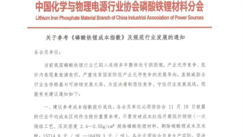 On the one hand, on November 18, the China Industrial Association of Power Sources issued a notice stating that power battery companies should use the average cost disclosed by the association as an important reference for their quotations and avoid breaking the cost red line by engaging in low-price dumping.