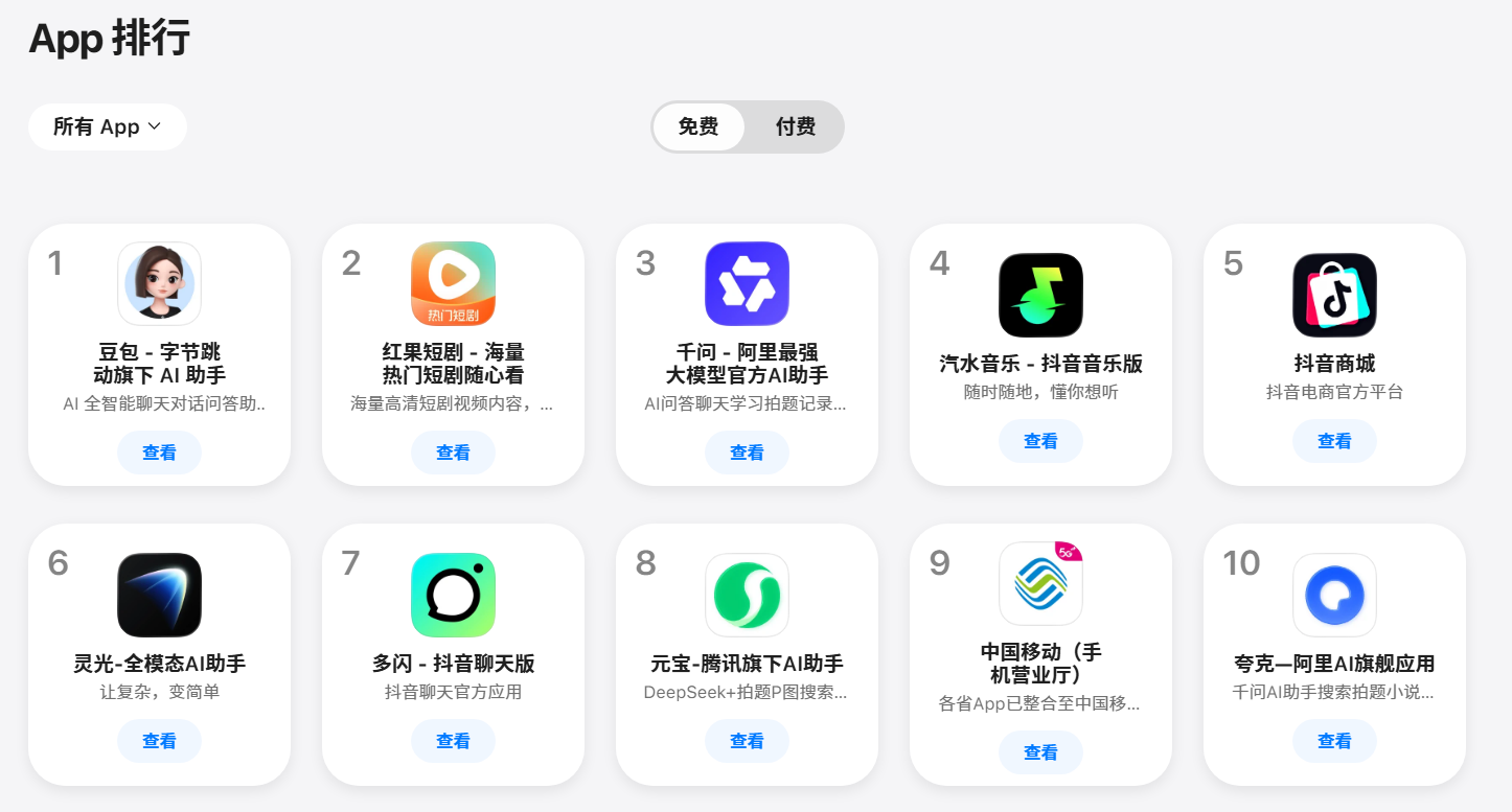 According to Guo Jing’s Internet Circle observations, on November 25th, AI assistants accounted for half of the top ten free apps on Apple’s App Store. Among them, Doubao (ByteDance) claimed the top spot, Qianwen (Alibaba) ranked third, Lingguang (Ant Group) sixth, Yuanbao (Tencent) eighth, and Kuake (Alibaba) tenth.