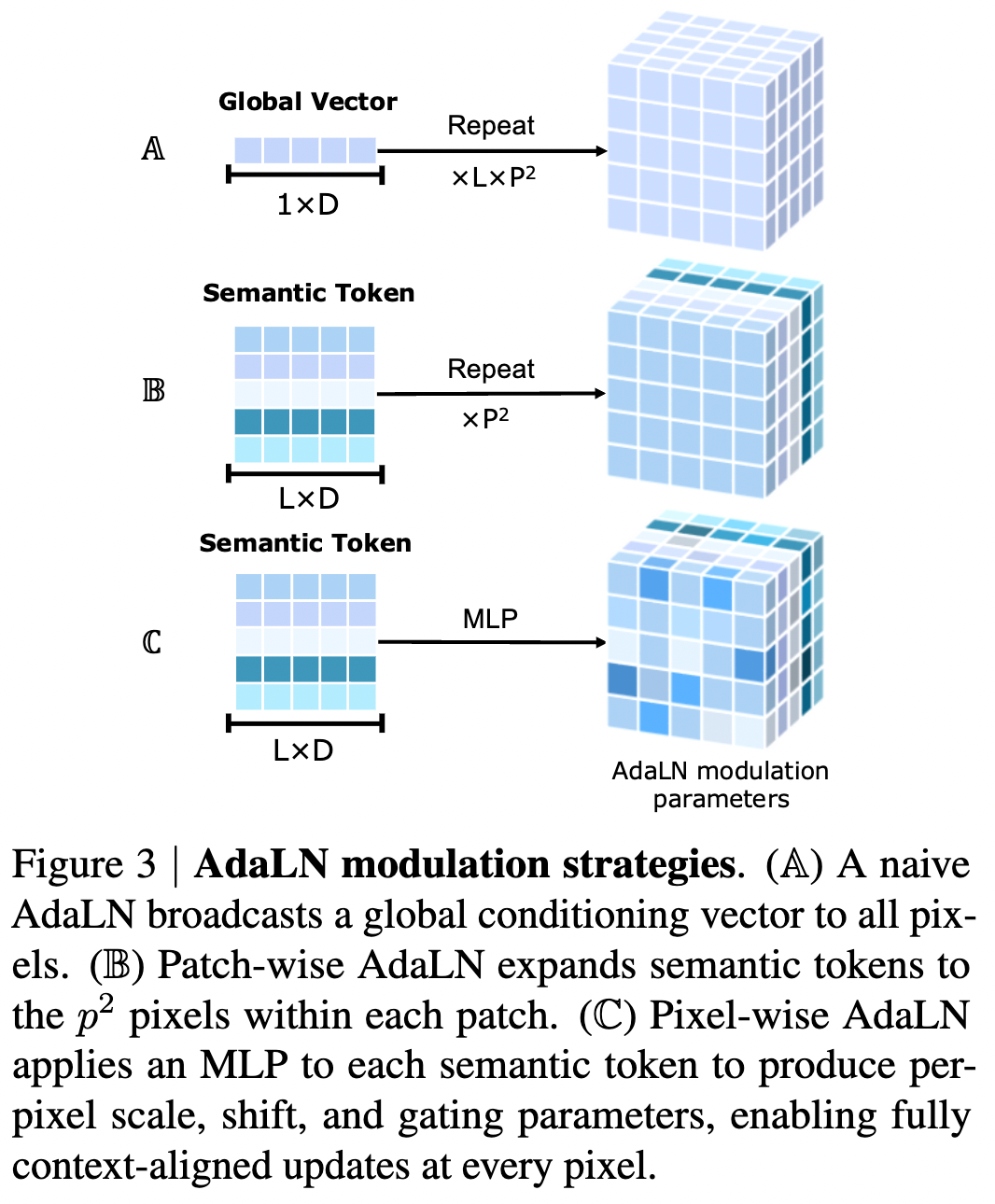 As shown in Figure 3(B), a direct patch-level modulation would repeat the same parameters for all pixels within a patch. However, this fails to capture dense per-pixel variations. Instead, this work expands into groups of AdaLN parameters through linear projection , assigning independent modulation to each pixel: