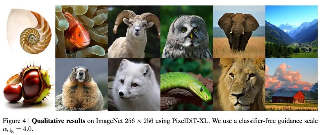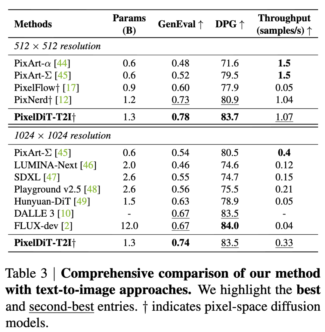 Scalability: Successfully extends to text-to-image generation and performs direct pretraining in a 1024×1024 pixel space. Achieves 0.74 on GenEval and 83.5 on DPG-bench, with performance approaching the best latent space diffusion models.