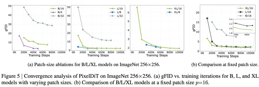 For the Base model, reducing to and significantly accelerates convergence: at 200K iterations, gFID drops from 48.5 (B/32) to 15.1 (B/16) and 6.7 (B/4), with B/4 ultimately reaching 3.4 gFID at 500K iterations. Larger models follow a similar trend, but the gains from extremely small patches diminish as model scale increases. For PixelDiT-L, using instead of only moderately improves gFID (from 2.72 to 2.15 at 300K iterations), while for PixelDiT-XL, the gap between and narrows further... (Note: The original text is truncated here.)