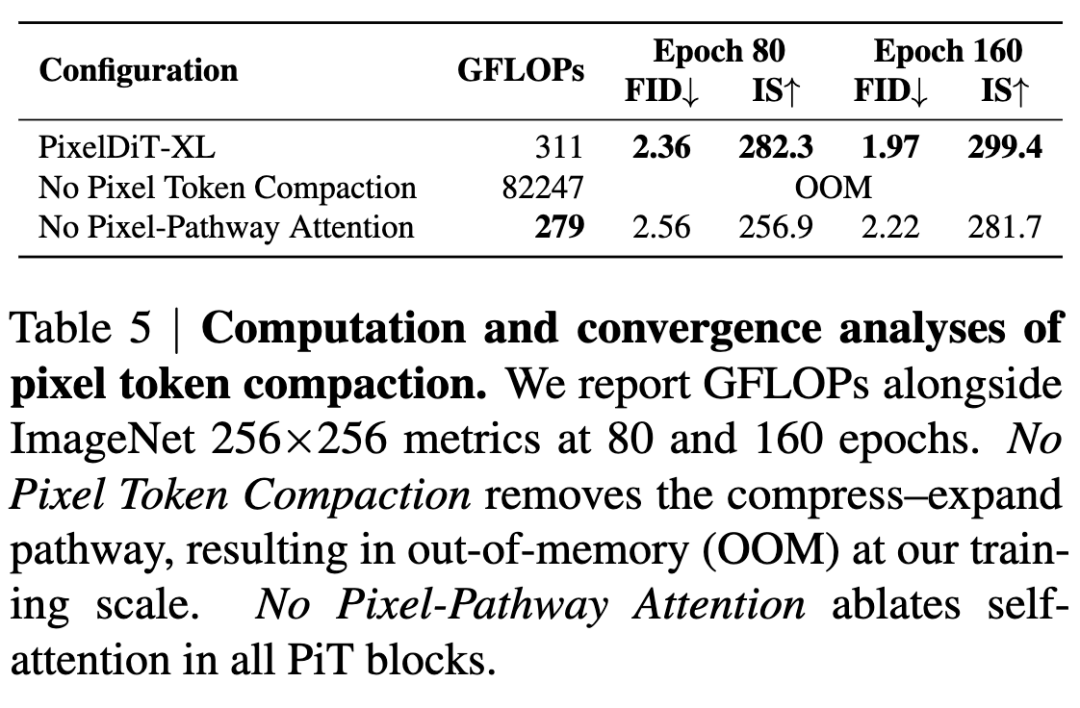 Token compaction is crucial for enabling feasible training in pixel space. Global attention on pixel tokens incurs memory usage and FLOPs, generating billions of attention entries even at resolutions, as shown by the 82,247 GFLOPs reported for this variant in Table 5. Utilizing pixel token compaction to group pixels into patches reduces sequence length to , resulting in a times reduction in attention overhead.