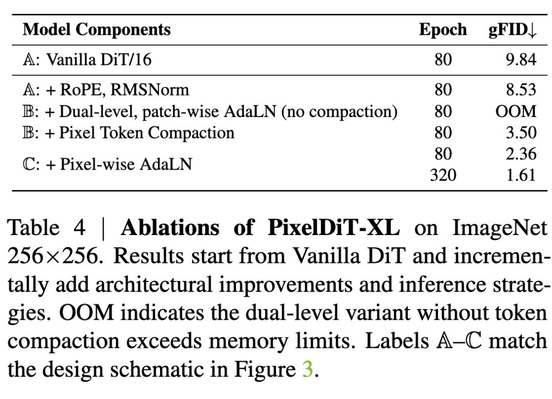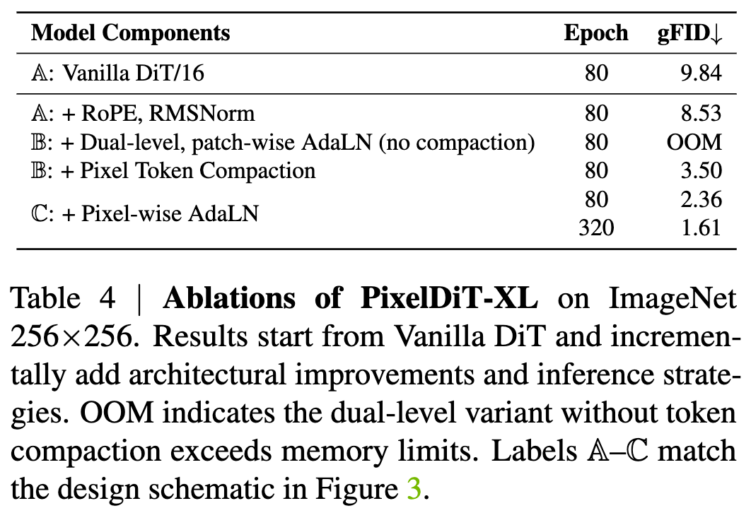 Table 4 quantifies the contributions of each pixel modeling component across different model variants. Note that labels A–C in Table 4 correspond to the design schematics in Figure 3. Specifically, this work uses a 30-layer, patchified DiT performing denoising directly in pixel space as the baseline model (labeled “Vanilla DiT/16”). This baseline operates only on patch tokens without dedicated pixel-level pathways, treating each patch as a high-dimensional vector. It achieves a gFID of 9.84 at 80 epochs.