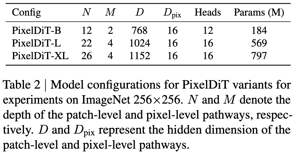 This work instantiates three model scales (B/L/XL), trained on ImageNet-1K for class-conditional tasks, with PixelDiT-XL as the default. Training details emphasize stable optimization and convergence speed: bfloat16 mixed precision, AdamW, EMA, phased settings for high gradient clipping thresholds, and a Rectified Flow-based training paradigm. For text-to-image, Gemma-2 is used as the frozen text encoder, with MM-DiT fusion introduced at the patch-level pathway; pre-trained at 512×512, followed by fine-tuning at 1024² with approximately 26 million pairs, covering various aspect ratios. During inference, FlowDPM-Solver (a DPMSolver++ variant in Rectified Flow form) is used, with 100 steps as the default for class-conditional and 25 steps for text-to-image to balance quality and latency.