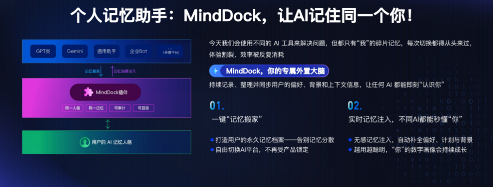 On November 27, 2025, Memory Tensor unveiled MemOS-MindDock, a cross-platform AI unified memory management assistant. It facilitates seamless cross-platform synchronization, enabling the transfer of historical dialogues, personal settings, and memory content from platforms like ChatGPT and Gemini, thus achieving controllable and manageable unified memory assets.