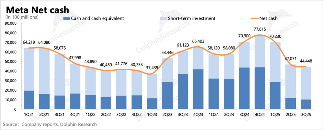 However, since the latter half of last year, the continuous rise in capital expenditures (Capex) has led to a sharp decline in Meta's cash reserves. By the end of Q3, cash plus short-term investments (mainly marketable securities) stood at $44 billion, down nearly 40% year-over-year.