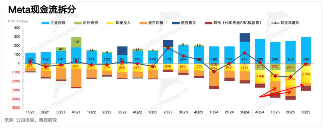 In our previous article, "Tencent: Starting from Stingy Repurchases, Is Super AI an Obvious Strategy?", we outlined the differences in cash flow management between Meta and Tencent. Meta adopts a "Cash Neutral" approach, where cash inflows stem from core business profits, while outflows are primarily allocated to business investments (including software, hardware, and fixed assets), shareholder returns (repurchases + dividends), external investments, and other expenses (such as tax withholdings).