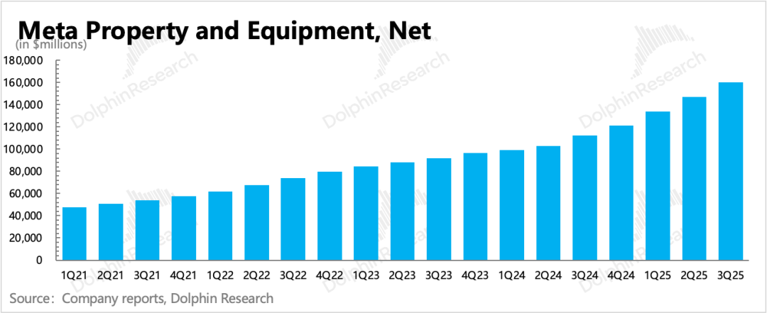 Even accounting for equipment replacements, compared to the previous investment scale of less than 20% of revenue, this still imposes at least an additional 3 percentage point profit margin impact. In reality, the value of replaced old servers pales in comparison to continuous new investments, with Meta's "Property and Equipment" book value steadily increasing over four years.