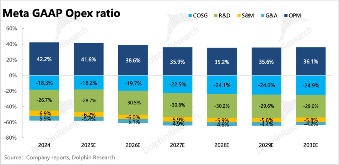 The impact of the aforementioned depreciation expenses on the decline in profit margins will peak in 2027, with a drop of 3 percentage points in one year, and will gradually ease after 2028. The possibilities of exceeding expectations include a significant reduction in computing power costs or more concessions from Meta in operating expenses, such as staff optimization. This could lead to the profit margin decline bottoming out earlier than Dolphin Research's expectations, but obviously, the former approach would be more effective.