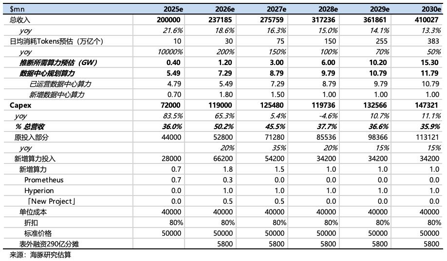 For other components, including leased computing power, land, and construction, assuming stable growth of 15-40% (based on data center deployment pace, slightly higher than the long-term revenue CAGR of 15%), the expected capital expenditure changes are as follows (note: this excludes any impromptu data center deployments by Meta, though computing power shortages may arise):