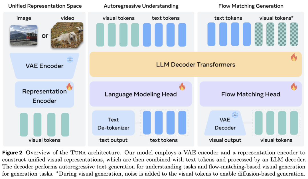 Tuna integrates an autoregressive model for text generation and a flow matching model for image/video generation.